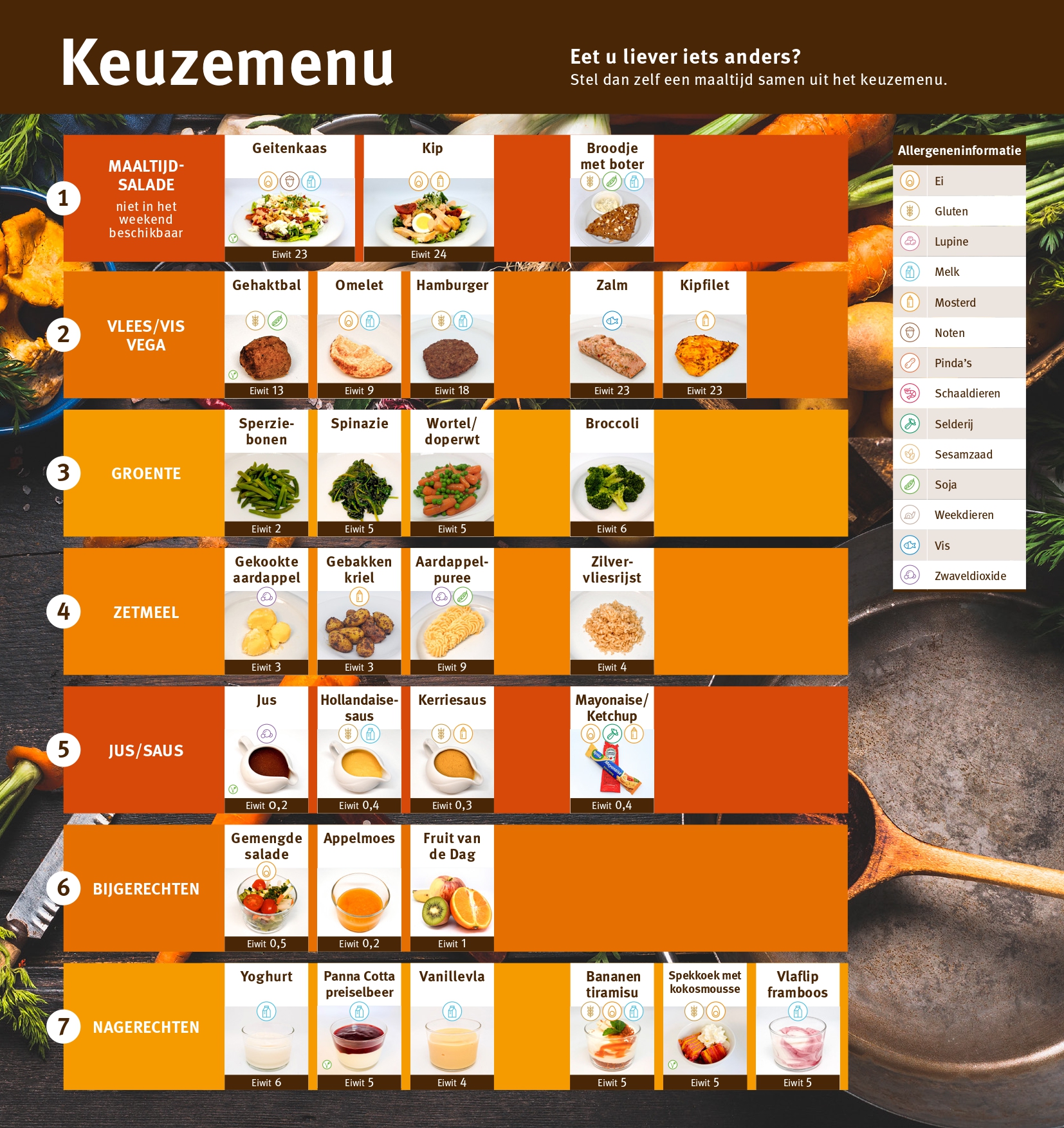 Blijven eten en goed bewegen tijdens een ziekenhuisopname is belangrijk. Eiwit is de belangrijkste voedingsstof voor uw herstel. Naast vlees, vis en gevogelte zijn er ook andere eiwitbronnen, zoals zuivel, kaas, ei, peulvruchten en noten. Bij Noordwest zorgen we er altijd voor dat de maaltijden een eiwitcomponent bevatten en onze vegetarische ‘menu’s van de chef’ zijn verrijkt met extra eiwitten. Ook tijdens uw ontbijt en lunch kunt u kiezen voor eiwitrijke voedingsmiddelen. Deze zijn als ‘eiwittoppers’ aangegeven op onze ontbijt- en lunchkaart.